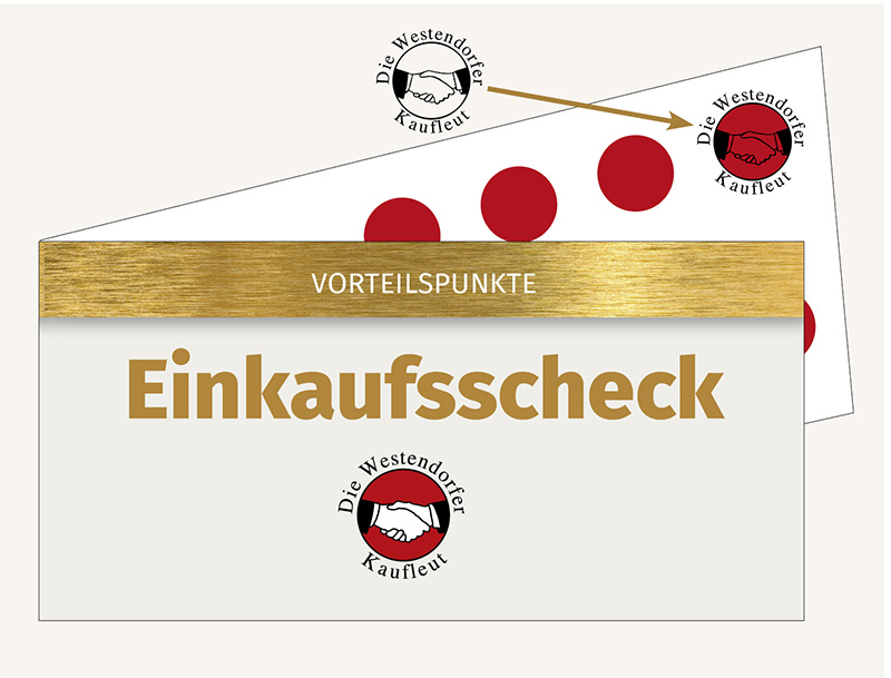 Sie kleben 20 Vorteilspunkte in den Einkaufsscheck und es werden Ihnen bei Ihrem Einkauf in einem Vorteilsgeschäft der Westendorfer Kaufleut € 8,- in Abzug gebracht. Vorteilsgeschäfte die an der Einkaufstür als Vorteilsgeschäft gekennzeichnet sind verteilen Vorteilspunkte, lösen Einkaufsschecks mit 20 eingeklebten Vorteilspunkten ein und nehmen Gutscheine entgegen.